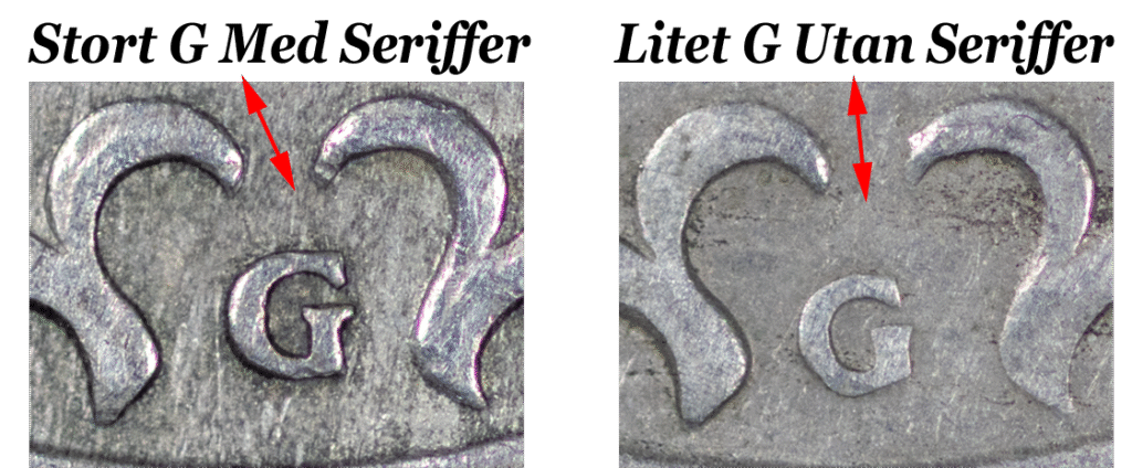 Den andra varianten är betydligt mer sällsynt. Här är myntmästarens märke något större, även om skillnaden är subtil. Det som gör det enkelt att skilja varianterna åt är att bokstaven G i denna version har tydliga seriffer, vilket syns klart vid förstoring.