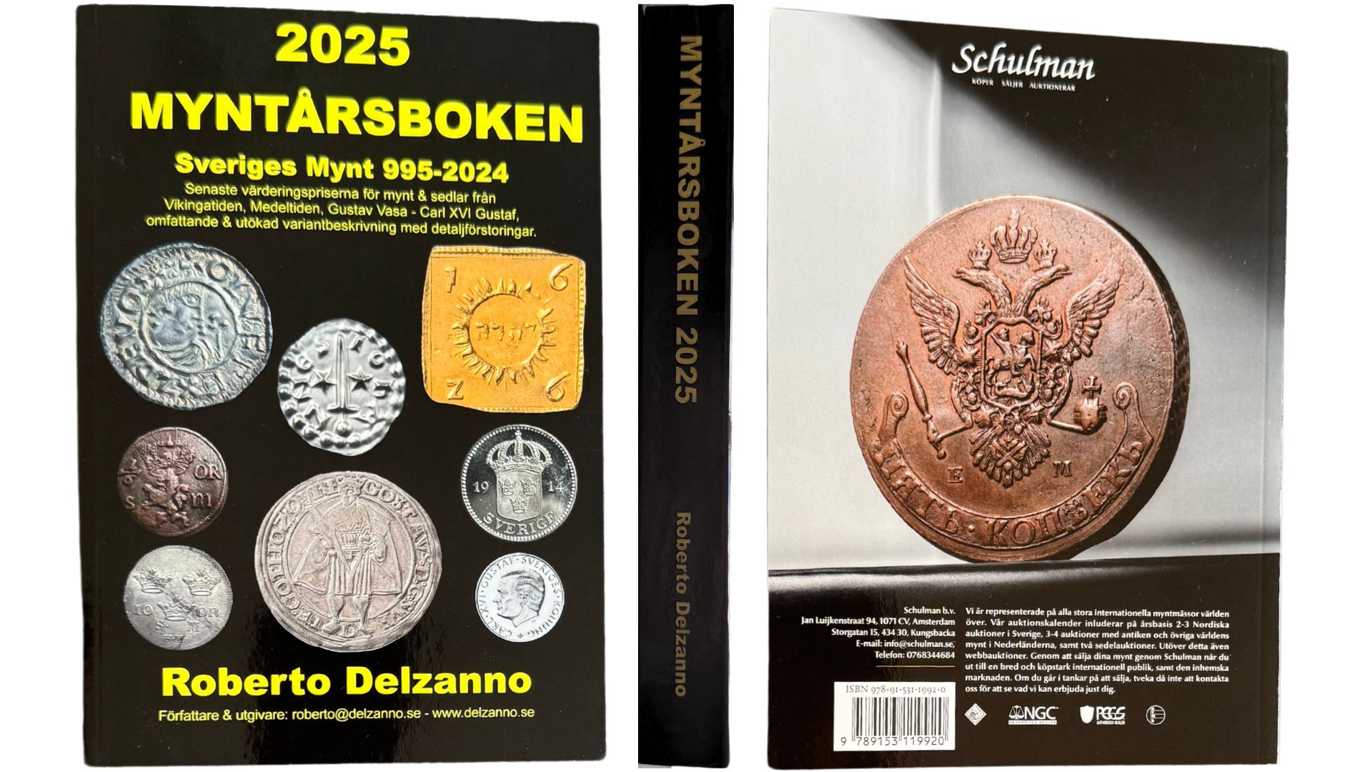Roberto Delzannos Myntårsboken 2025 täcker svenska mynt från 995 till 2024 och är fullmatad med värderingstabeller och uppdaterad information för samlare på alla nivåer.