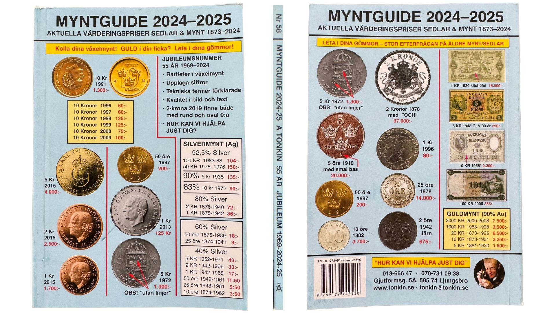 Archie Tonkins MYNTGUIDE 2024–2025 ger dig snabba värderingar för svenska sedlar och mynt från 1873 till 2024. En uppskattad följeslagare bland samlare sedan 1969.