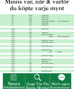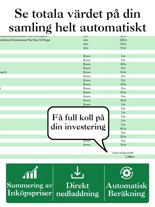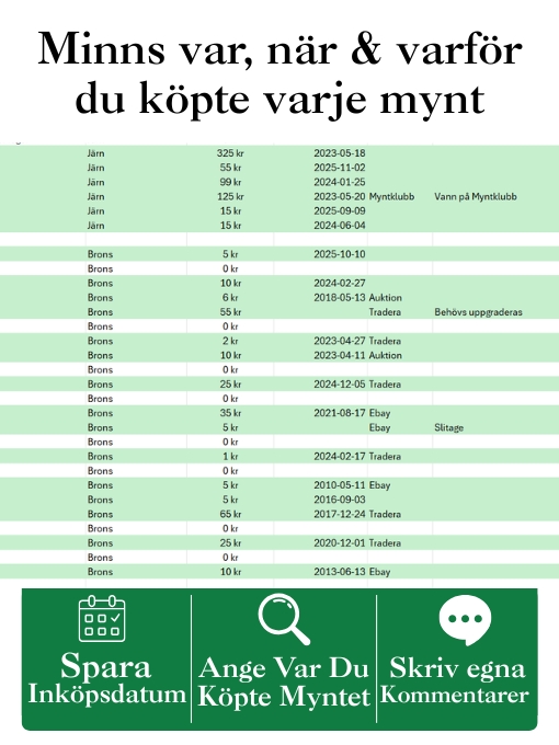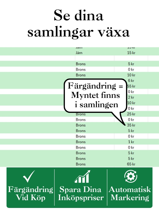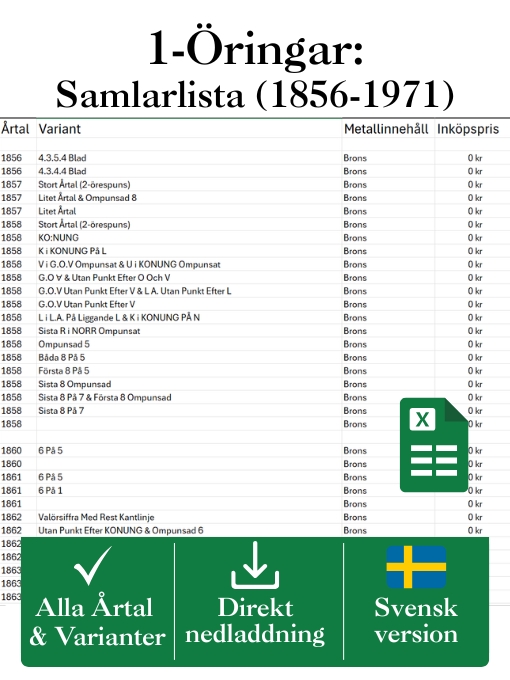 Samlarvänlig Excelfil med alla svenska 1-öringar 1856–1971. Följ din samling, dokumentera köp och få full överblick.