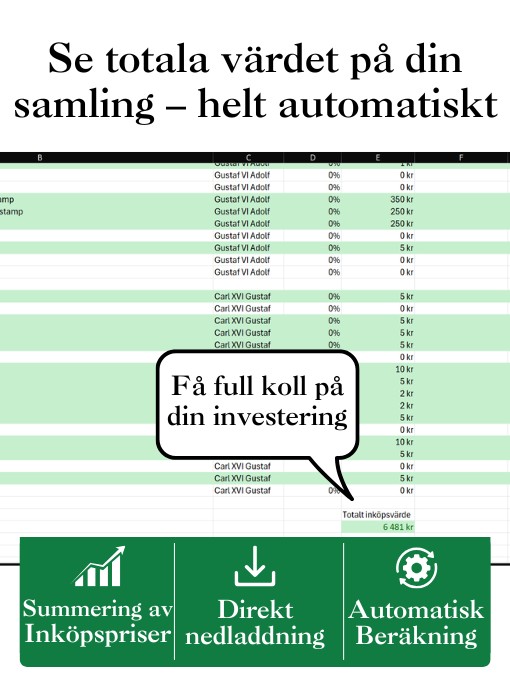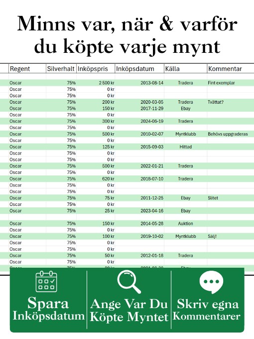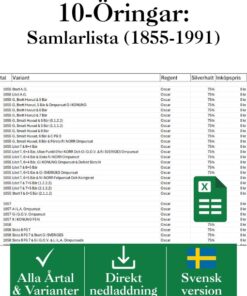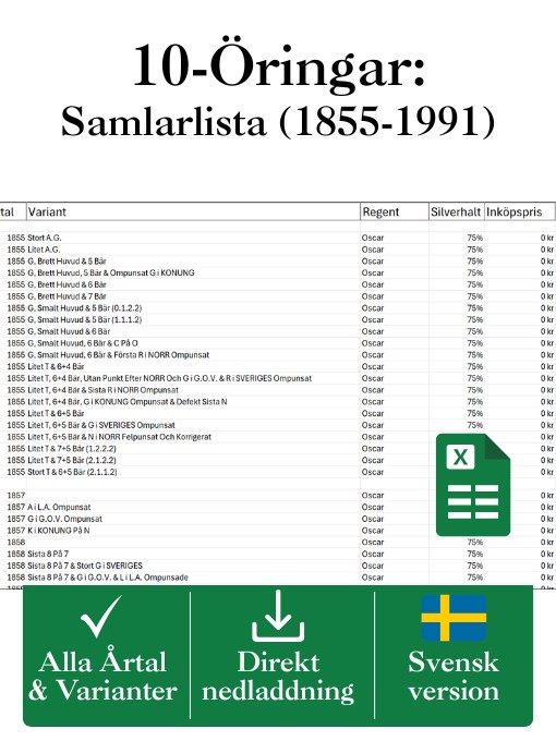 Samlarvänlig Excelfil med alla svenska 10-öringar mellan 1855-1991. Markera egna köp, följ värdet och lägg till anteckningar!