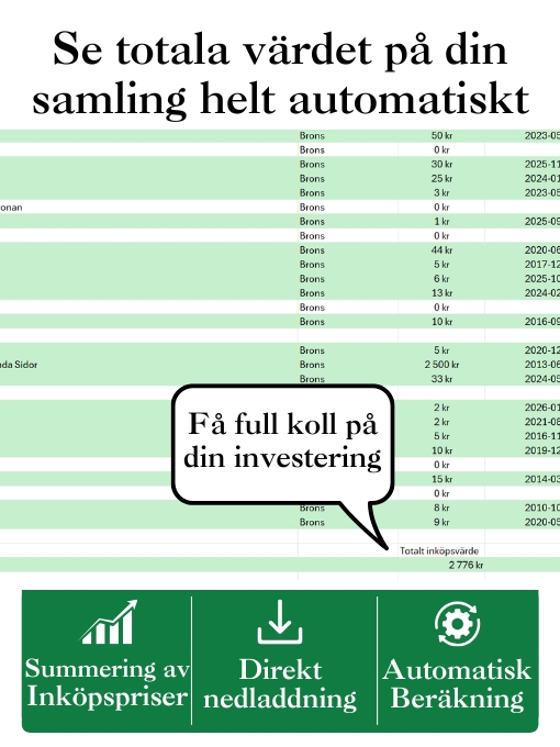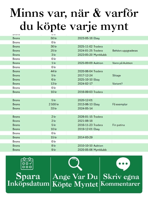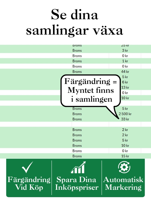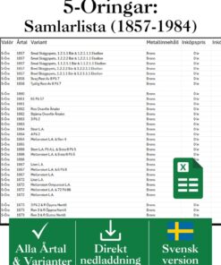 Samlarvänlig Excelfil med alla svenska 5-öringar 1857–1984. Följ din samling, dokumentera köp och få full överblick.