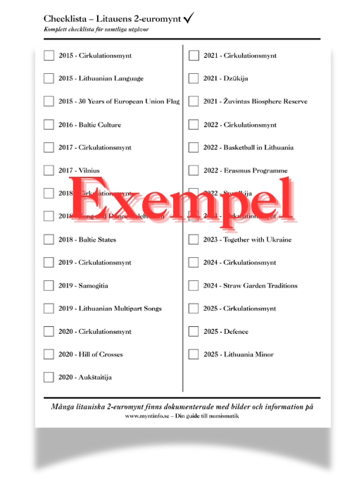 Komplett A4-checklista över Litauens 2-euromynt 2015–2025, inklusive både cirkulationsmynt och minnesutgåvor. Levereras som digital PDF, perfekt att skriva ut och använda.