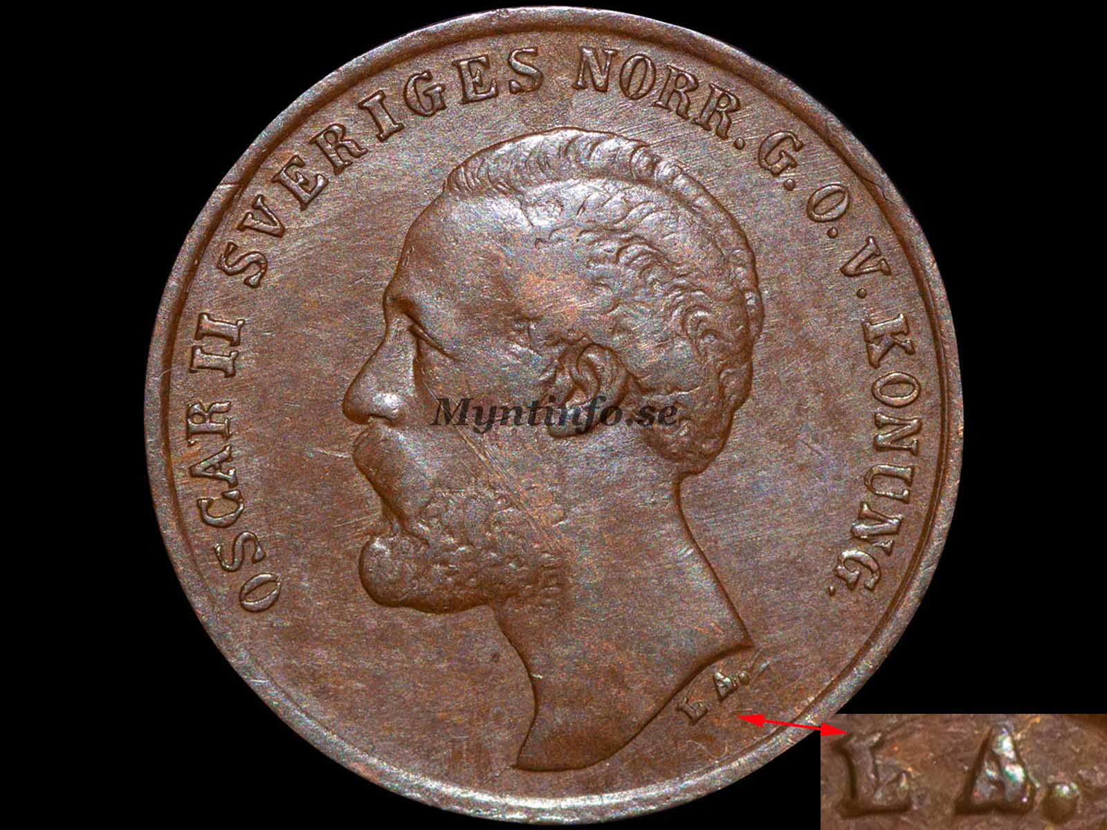 | Framsida (åtsida) | -OSCAR II SVERIGES NORR. G.O.V. KONUNG. – L.A. |