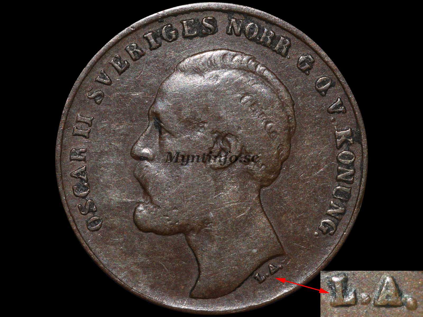| Framsida (åtsida) | -OSCAR II SVERIGES NORR. G.O.V. KONUNG. – L.A. |