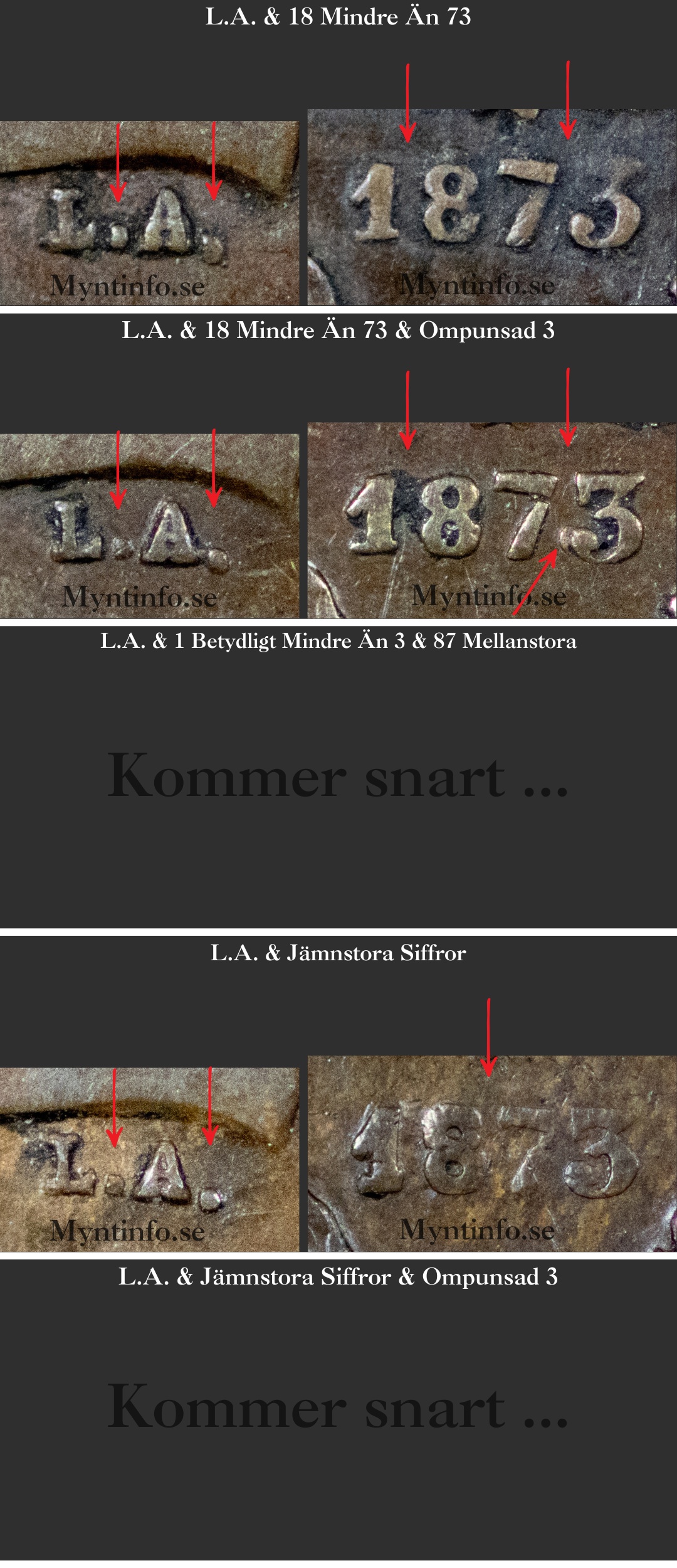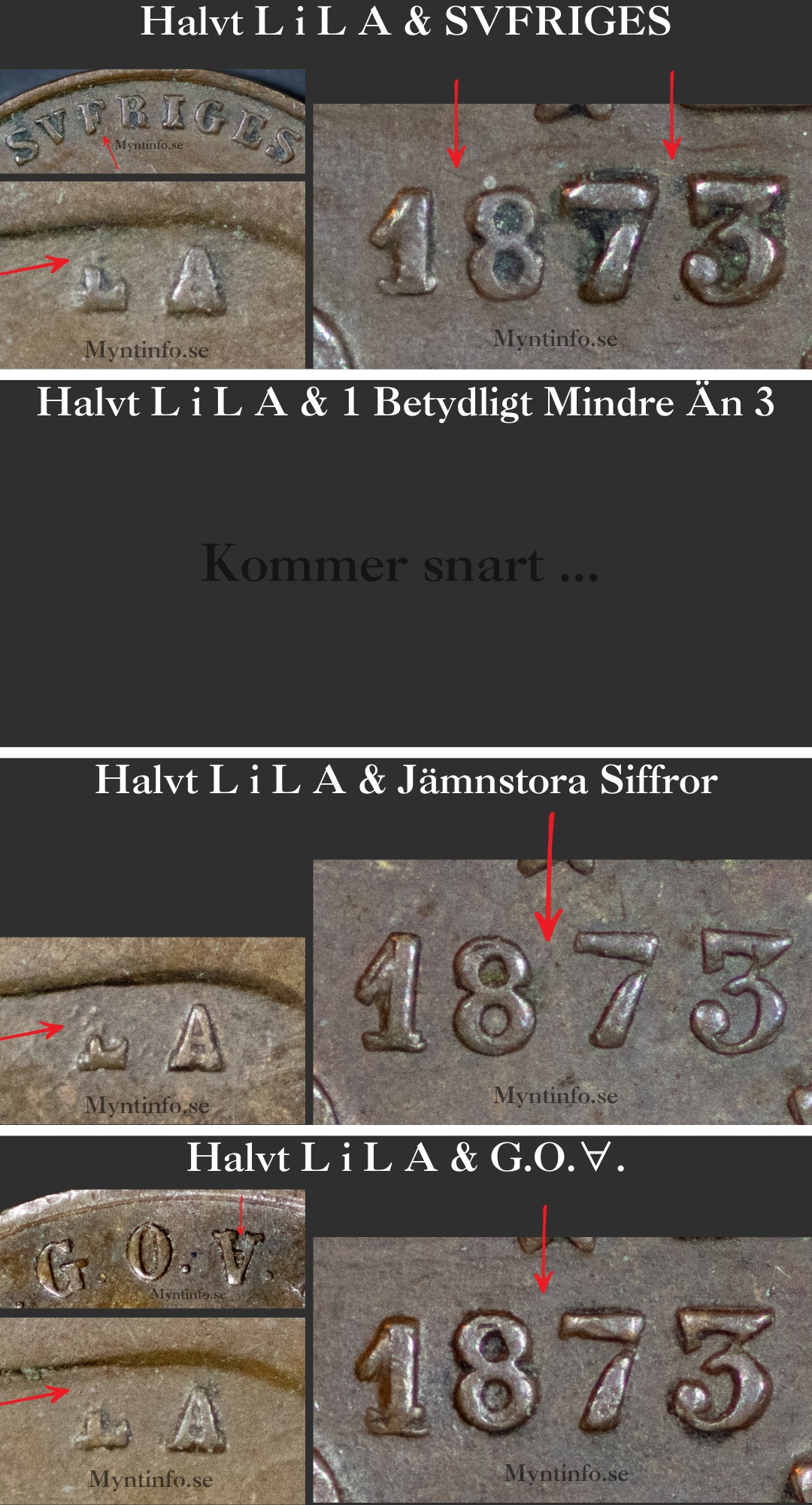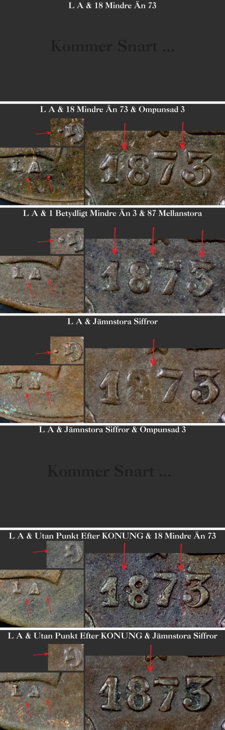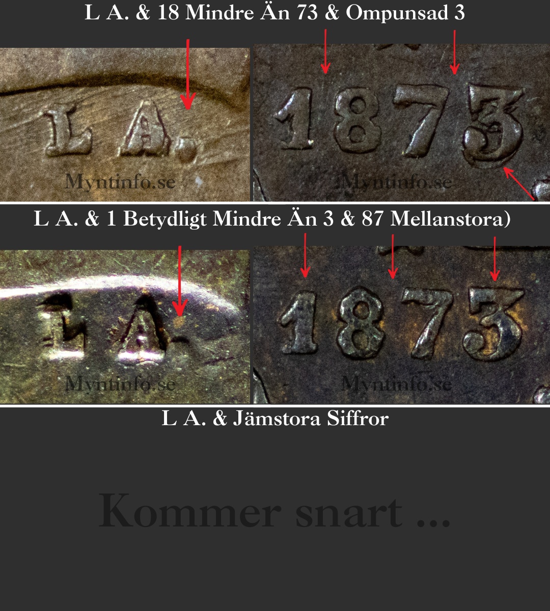 Vi på Myntinfo arbetar aktivt med att reda ut frågetecknen kring 1873. Särskilt varianten ”1 betydligt mindre än 3 & 87 mellanstora” är svåranalyserad då den är extremt lik ”18 mindre än 73”. Vi behöver få in fler exemplar för att vara 100% säkra på om vi ska behålla denna som en egen huvudvariant.