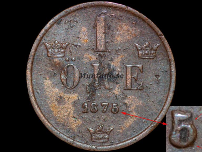 Vi på Myntinfo har en teori om att varianten ”5 på 4” är ett resultat av en direkt återanvändning av stampar från föregående år. År 1874 präglades en stor mängd 1-öringar, och det är mycket troligt att man vid årsskiftet hade färdigställda stampar kvar som ännu inte blivit utslitna. För att spara tid och material valde gravören att helt enkelt punsa in den nya årtalssiffran över den gamla. Att resterna är så pass minimala tyder på att man har försökt polera bort den gamla fyran, men att punstrycket var tillräckligt djupt för att lämna kvar de karaktäristiska spåren vi ser i dag.