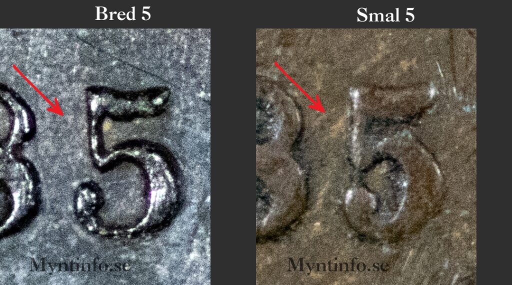 Vi på Myntinfo har en teori om att dessa två varianter representerar ett byte av sifferpunsar under pågående produktion. Vid den här tiden var det inte ovanligt att man använde olika verktygsuppsättningar för att färdigställa stamparna. Den ”Breda 5:an” bär på en stil som påminner om de tidigare årgångarna under 1880-talet, medan den ”Smala 5:an” kan ha varit ett försök att modernisera typsnittet eller helt enkelt resultatet av att en ny sifferpuns togs i bruk när den gamla blivit utsliten. Att den smala varianten är sällsyntare tyder på att den kan ha introducerats sent under präglingsåret.