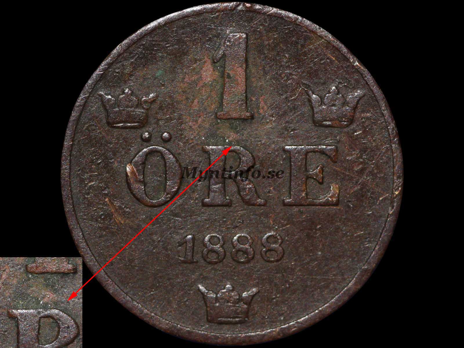Vi på Myntinfo har noterat att 1888 års präglingar bär på samma dualitet som åren direkt efter. Att vi ser båda varianterna här tyder på att man vid produktionens start efter det präglingsfria året 1887 använde en blandning av stampar. Vår teori är att man i samband med att produktionen återupptogs plockade fram både nya stampar med centrerad valöretta och äldre reservstampar från början av decenniet. Det gör 1888 till ett nyckelår för att förstå hur de olika placeringsvarianterna kom att existera sida vid sida under Oscar II:s regeringstid.