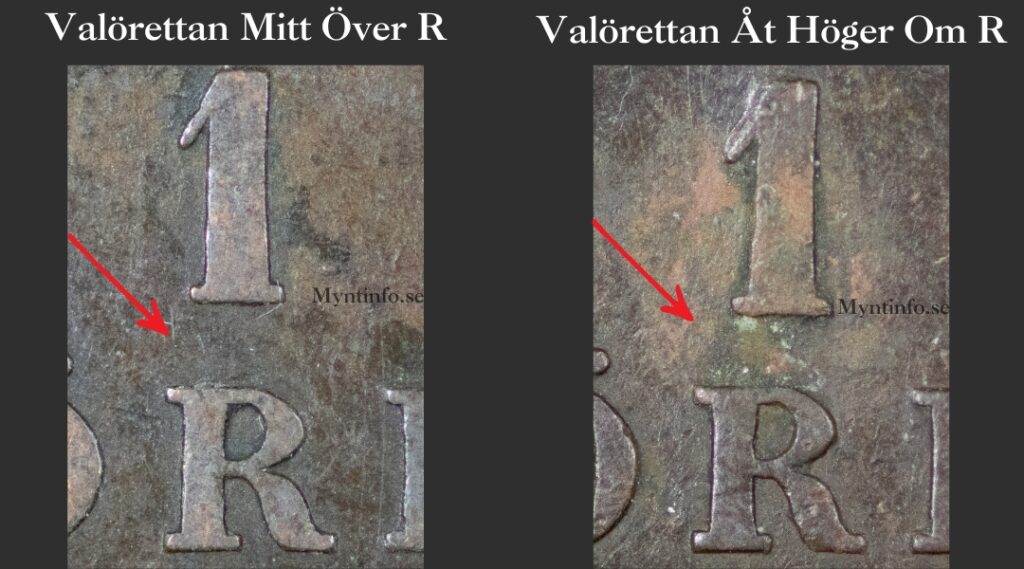 På bilden nedan har vi skapat en samlingsbild på båda variantnerna sida vid sida, så att du enkelt kan se skillnaden i valörettans placering på de två olika mynten.