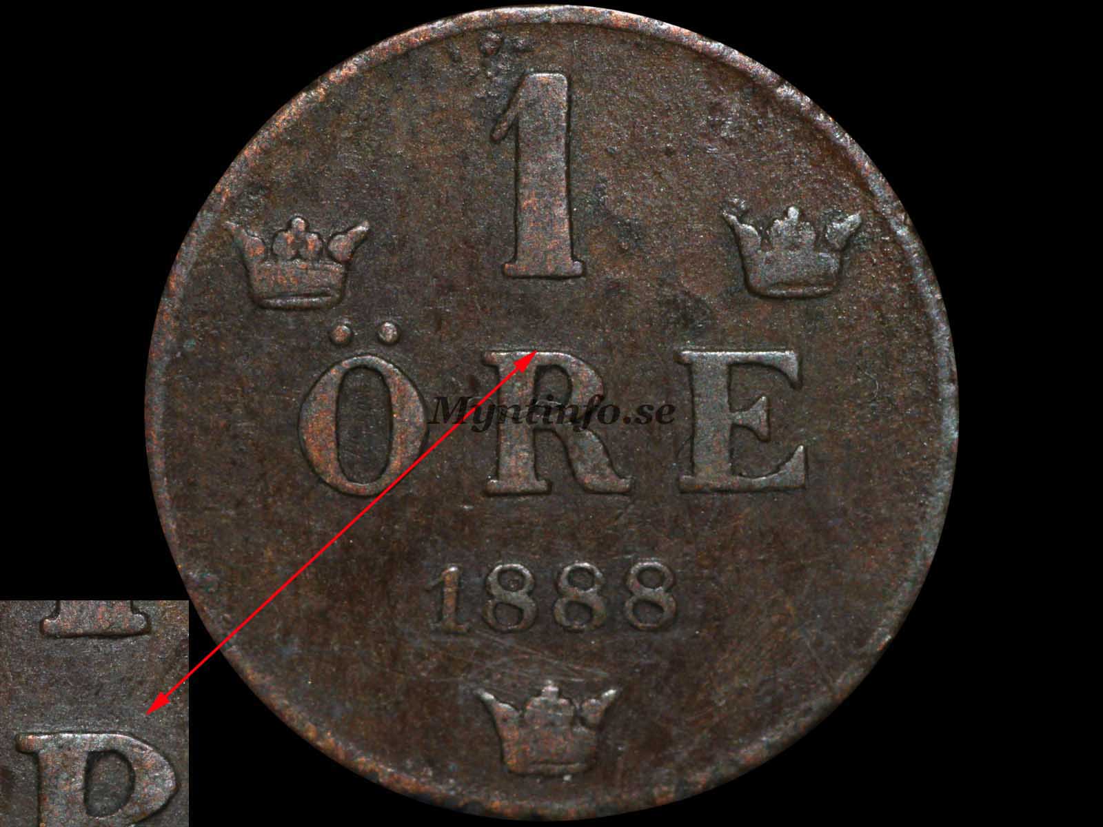 Vi på Myntinfo har noterat att 1888 års präglingar bär på samma dualitet som åren direkt efter. Att vi ser båda varianterna här tyder på att man vid produktionens start efter det präglingsfria året 1887 använde en blandning av stampar. Vår teori är att man i samband med att produktionen återupptogs plockade fram både nya stampar med centrerad valöretta och äldre reservstampar från början av decenniet. Det gör 1888 till ett nyckelår för att förstå hur de olika placeringsvarianterna kom att existera sida vid sida under Oscar II:s regeringstid.