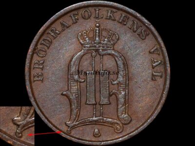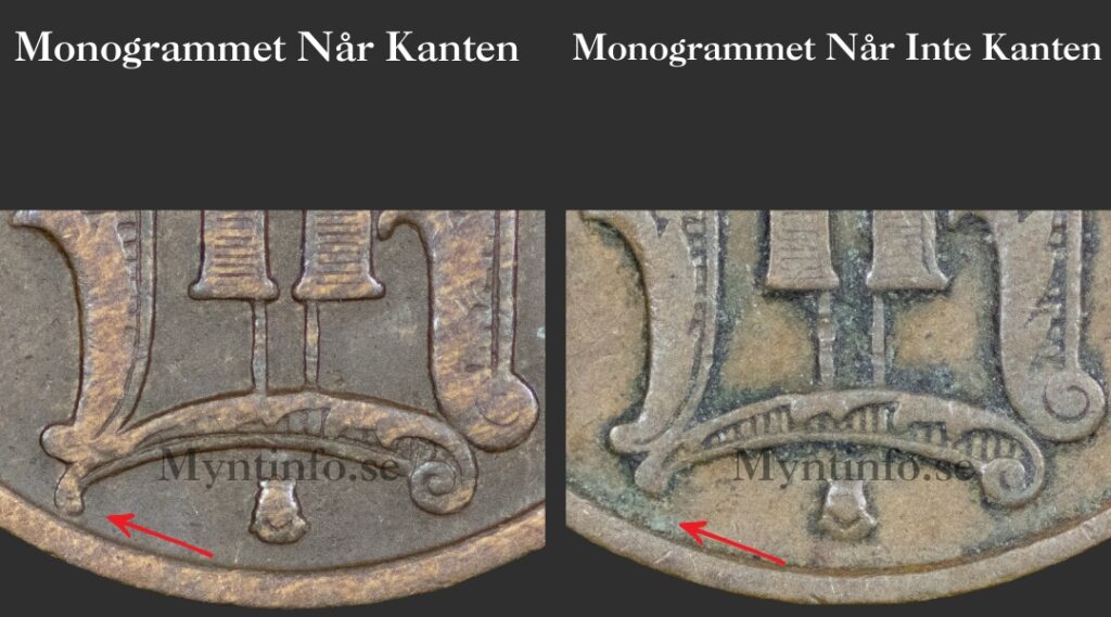 Den andra varianten är något sällsyntare. Här har monogrammet en mer utdragen form i det nedre vänstra hörnet, vilket gör att spetsen sträcker sig ända fram och faktiskt nuddar myntets kant. Denna detalj ger monogrammet ett mer fylligt utseende på åtsidan.