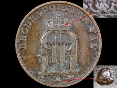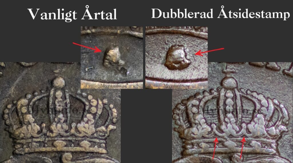 På bilden nedan har vi skapat en samlingsbild på båda varianterna. Här kan du jämföra den vanliga S:t Erik-bilden och kronan mot de dubblerade detaljerna på den sällsynta varianten.