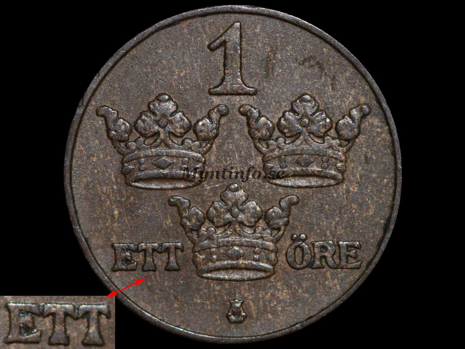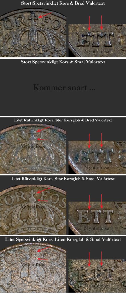 Här ser vi samma lilla rätvinkliga kors och stora korsglob som på Variant 3. Skillnaden är återigen baksidans valörtext ”ETT”, som på denna variant är smal med tydliga mellanrum mellan bokstäverna.
