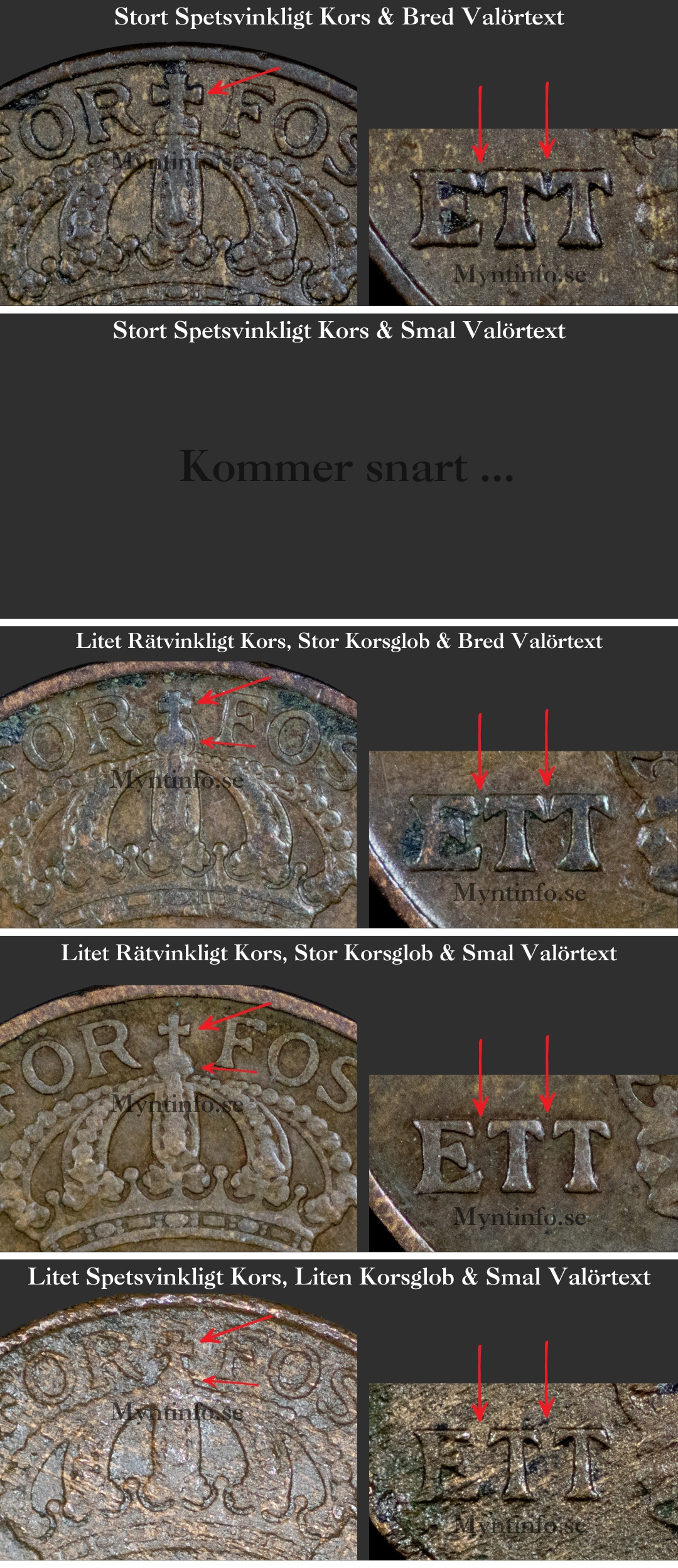 På bilden nedan har vi skapat en samlingsbild som täcker de flesta av varianterna. Du kan här studera skillnaderna mellan de olika korsen, globernas storlek samt den smala kontra den breda valörtexten.