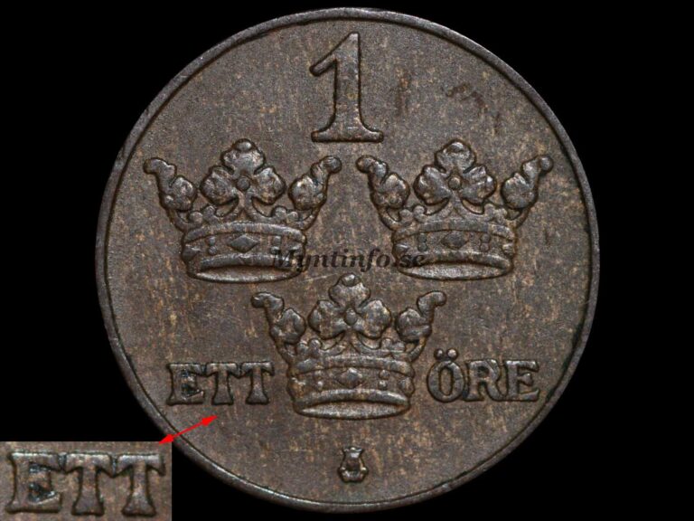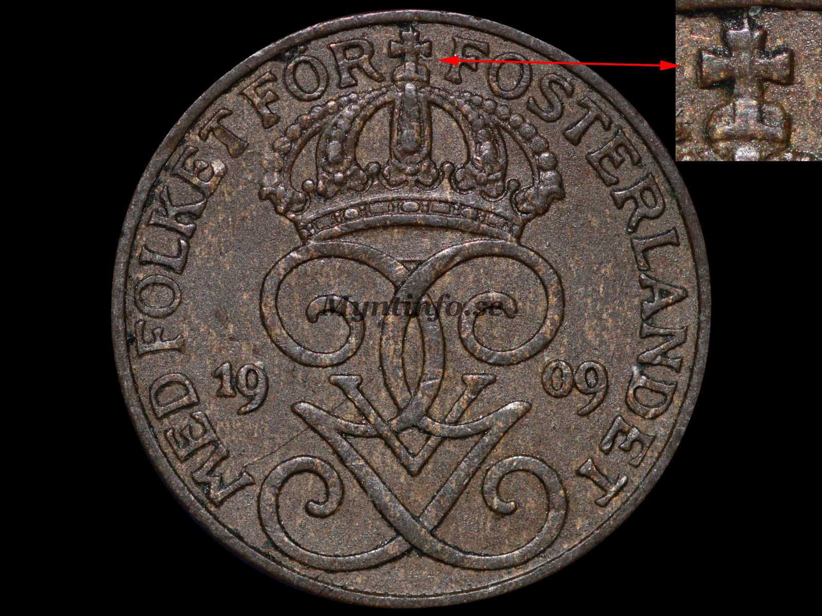 År 1909 är ett exceptionellt år inom 1-öresserien med hela fem kända varianter. Skillnaderna ligger i kombinationer av kronans kors, korsgloben och bredden på valörtexten. Här går vi igenom samtliga för att du ska kunna identifiera din utgåva.