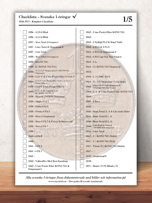 1-öringen är en mycket omfattande serie som sträcker sig över mer än 100 år. Räknar man både årtal och kända varianter blir serien betydligt större än många först tror. På Myntinfo bygger vi successivt upp en komplett översikt över alla svenska 1-öringar. För dig som vill få bättre kontroll över samlingen erbjuder vi även våra digitala samlarverktyg: 📄 Se PDF-checklistan för 1-öringar 📊 Se Excel-verktyget för 1-öringar