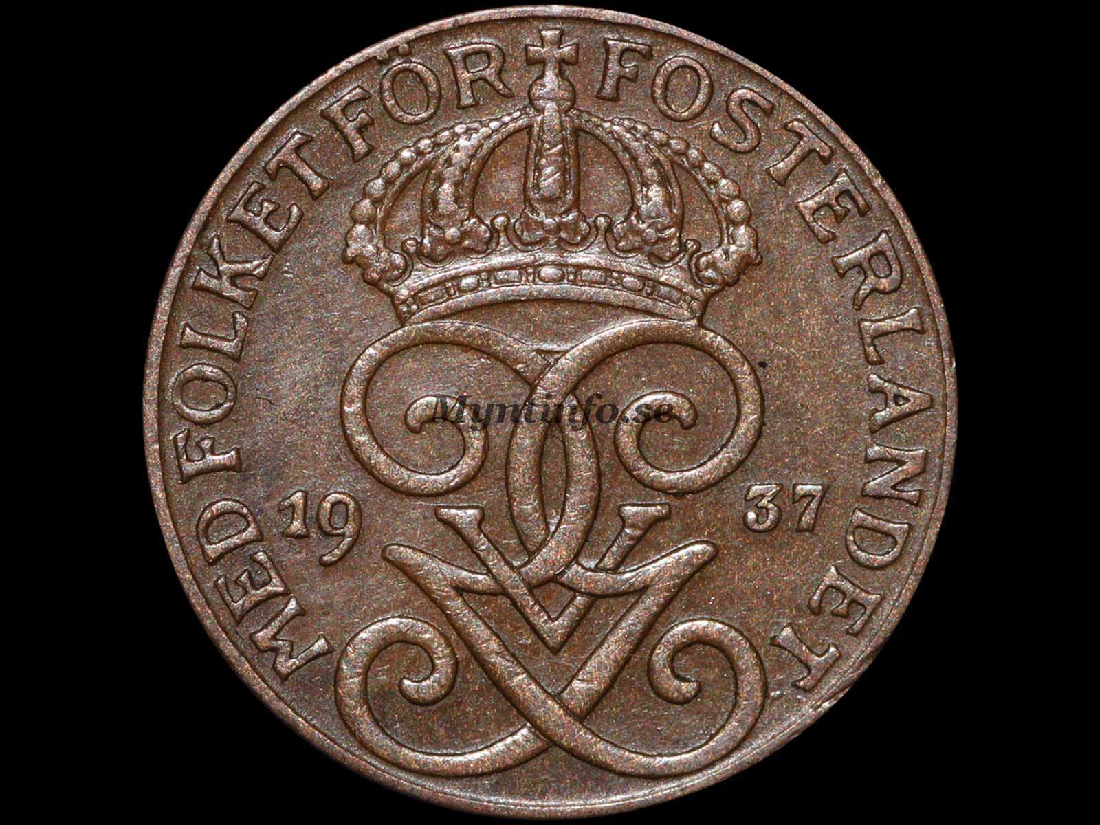 Detta är utan tvekan den mest sällsynta och eftertraktade varianten från 1937. Här har hela frånsidan blivit ”dubblerad”, vilket innebär att stampen har lämnat dubbla avtryck. Detta syns allra tydligast på texterna ”ETT” och ”ÖRE”, men även bilden av S:t Erik uppvisar tydliga spår av dubblering, vilket gör varianten mycket unik.