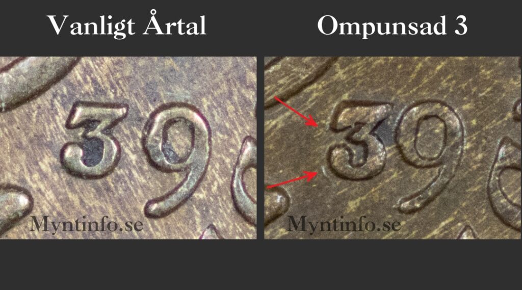 Något som vi på Myntinfo har noterat är att avståndet mellan siffrorna 3 och 9 skiljer sig markant åt mellan de två varianterna. På det vanliga årtalet är mellanrummet något större, medan siffrorna 3 och 9 sitter mycket tätt ihop på varianten med den ompunsade trean.