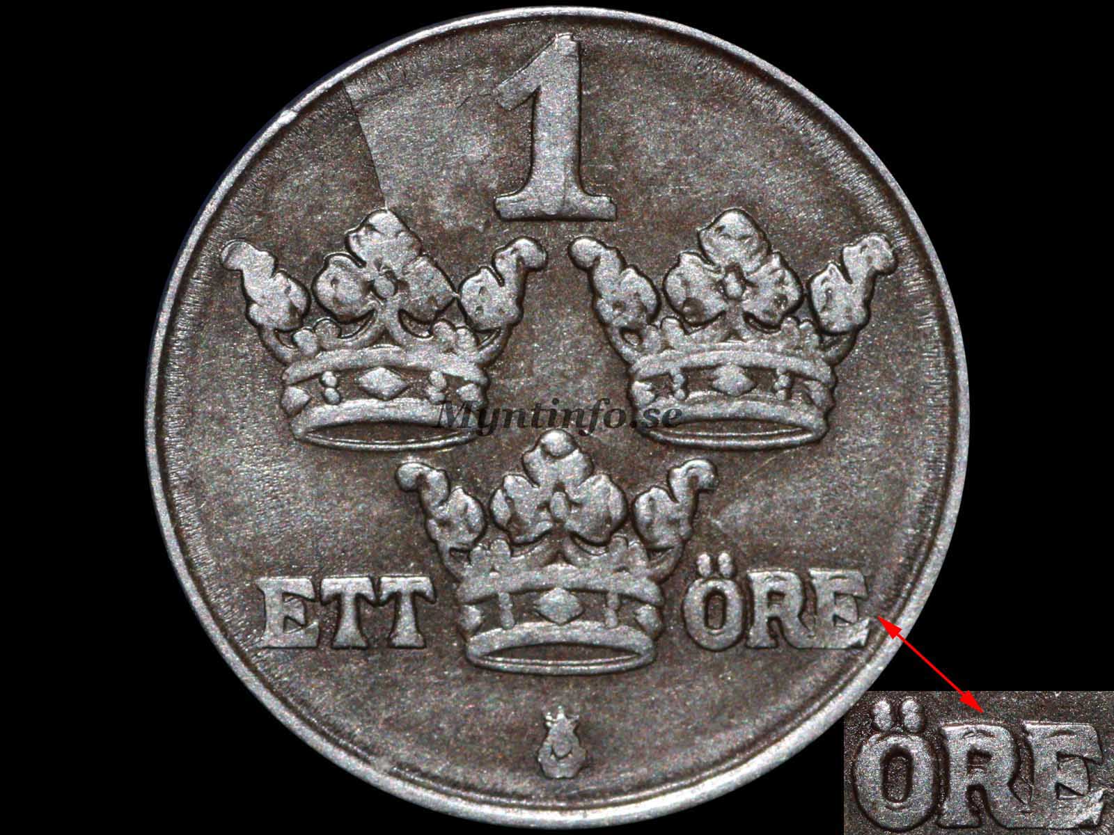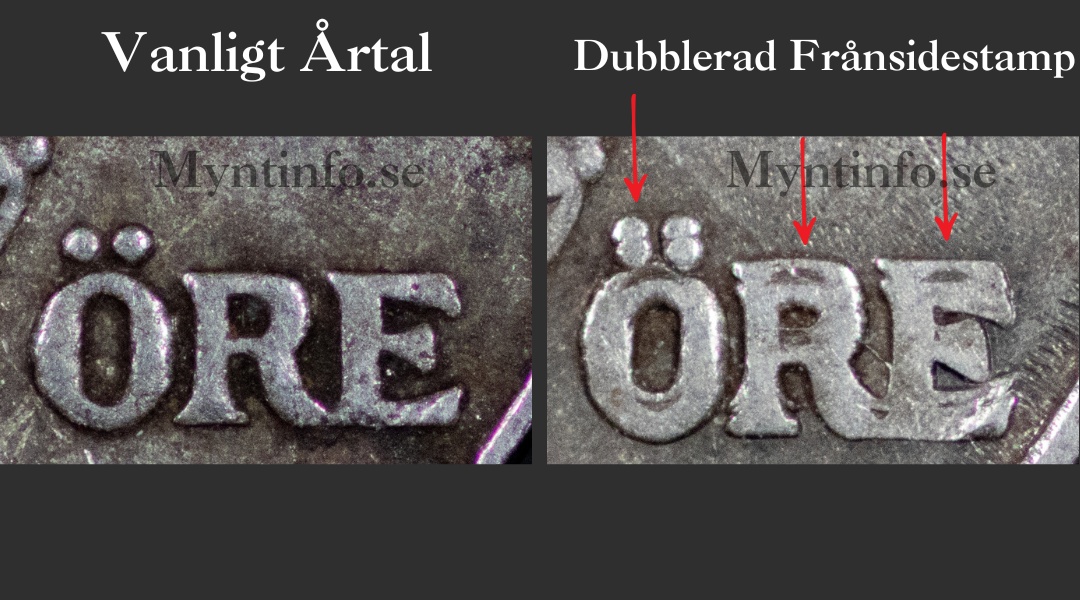 På bilden nedan har vi skapat en samlingsbild på båda varianterna bredvid varandra, så att man tydligt kan jämföra utseendet på ordet ”ÖRE” mellan den vanliga och den dubblerade stampen.