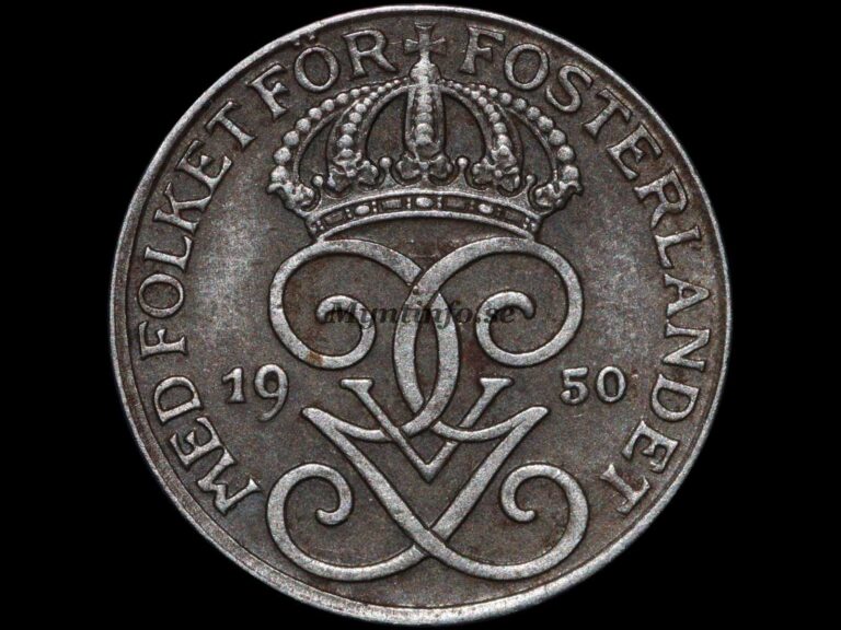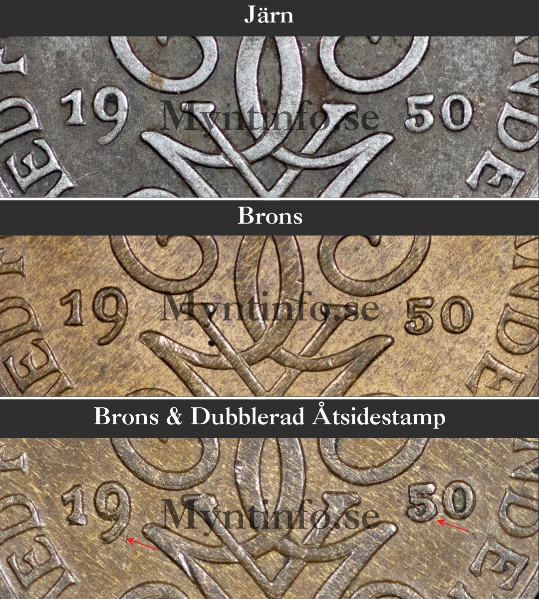 Detta är den mest sällsynta och eftertraktade varianten från 1950. Den är också tillverkad i brons, men det unika här är att åtsidan har blivit vad man kallar ”dubblerad”. Vi på Myntinfo noterar att även om hela åtsidans stamp uppvisar spår av dubblering (inklusive monogrammet), så är det på årtalet och särskilt siffrorna 1 och 9 som de tydligaste resterna syns.