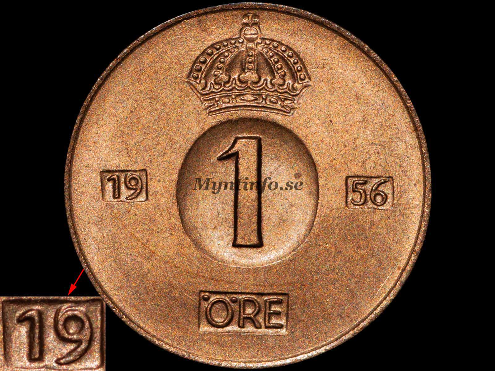 För år 1956 finns det två välkända huvudvarianter inom 1-öresserien. Utöver dessa har det nyligen rapporterats om en tänkbar tredje variant, som vi på Myntinfo kommer att undersöka närmare under 2026 för att försöka bekräfta dess status.