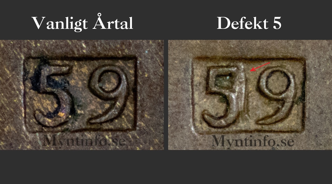 Den andra varianten är betydligt ovanligare och är utan tvekan den mest eftersökta av de två. Den kallas för ”Defekt 5” på grund av en tydlig präglingsdefekt i årtalet. Det man letar efter här är en form av klump eller ett kraftigt streck som sitter till höger om siffran 5, vilket ger siffran ett deformerat utseende.
