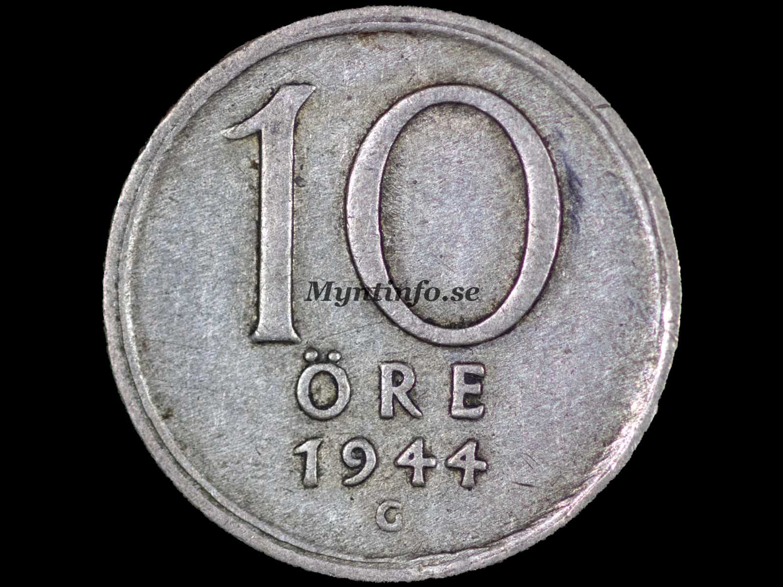 | Baksida (frånsida) | -10 – ÖRE – 1944 – G |