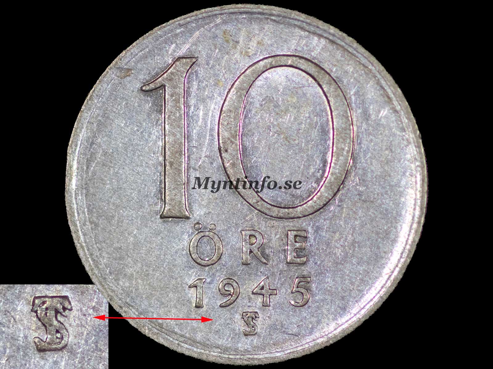 | Baksida (frånsida) | -10 – ÖRE – 1945 – TS |