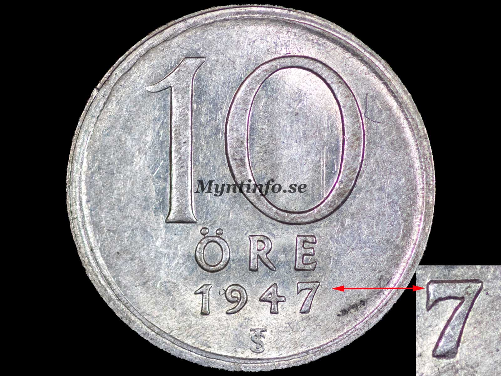 År 1947 är ett år med många varianter på flera olika valörer, men just för 10-öringarna finns det två kända och relativt lätta varianter som vi går igenom här nedan. Längst ner finns även en bonusbild som visar båda varianterna bredvid varandra.