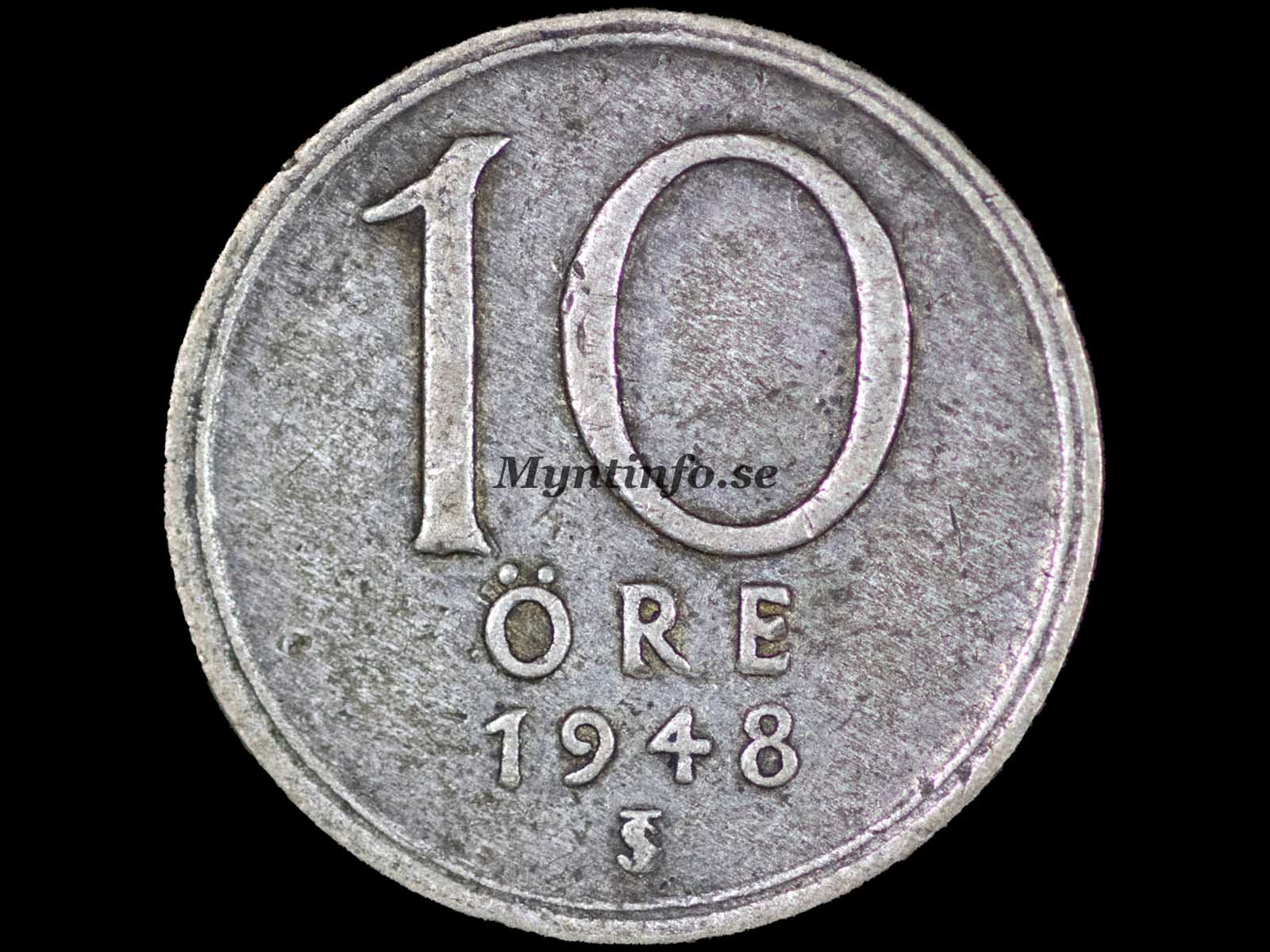 År 1948 finns det uppgifter om två olika varianter inom 10-öresserien. Vi har för närvarande endast dokumenterat den vanliga varianten. Den andra, som är betydligt mer ovanlig, kallas för ”Nål i kronans botten”. Namnet syftar på ett präglingsfel där det ser ut som en nål som går genom botten av kronan på frånsidan av myntet. Sidan kommer att uppdateras med mer information så snart vi kunnat undersöka denna sällsynta variant närmare.