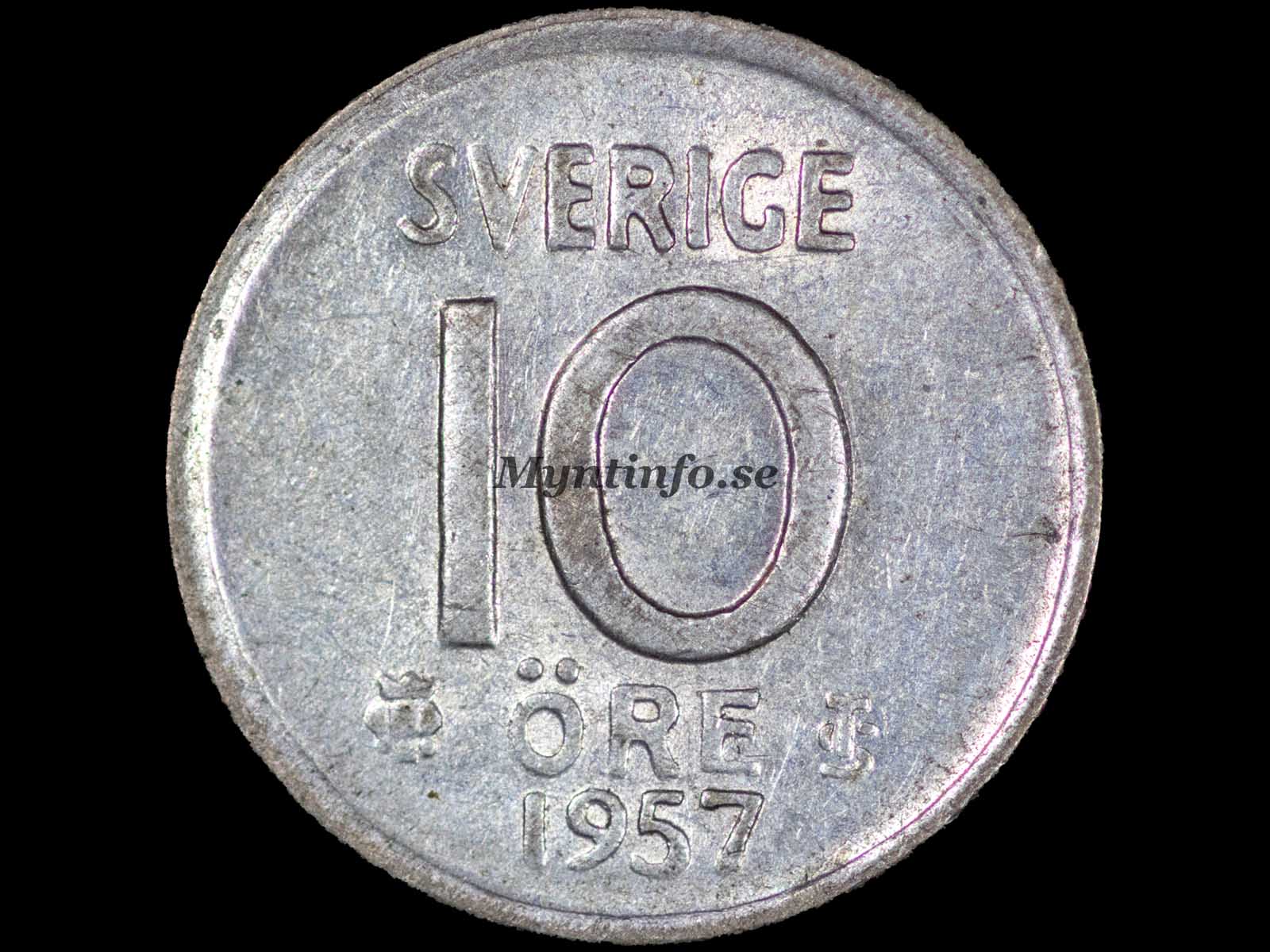 | Baksida (frånsida) | -SVERIGE – 10 – ÖRE TS – 1957 |