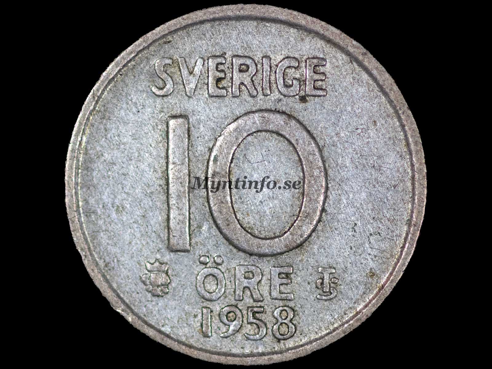 | Baksida (frånsida) | -SVERIGE – 10 – ÖRE TS – 1958 |