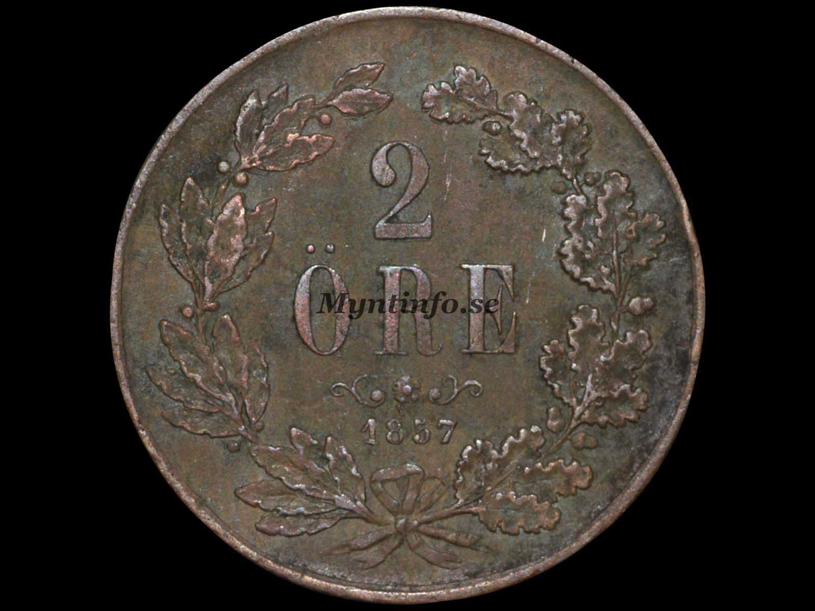 2-Öre 1857 (Långt Skägg, Locken Under Punkten & 2.3.4.5.5 Blad)