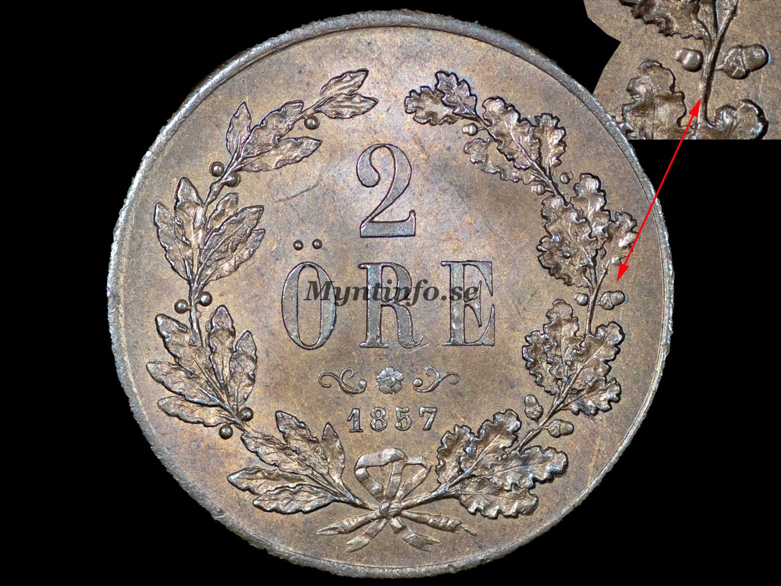 2-Öre 1857 – Kort Skägg, Två Ekollon & 2.3.5.5.5 Blad