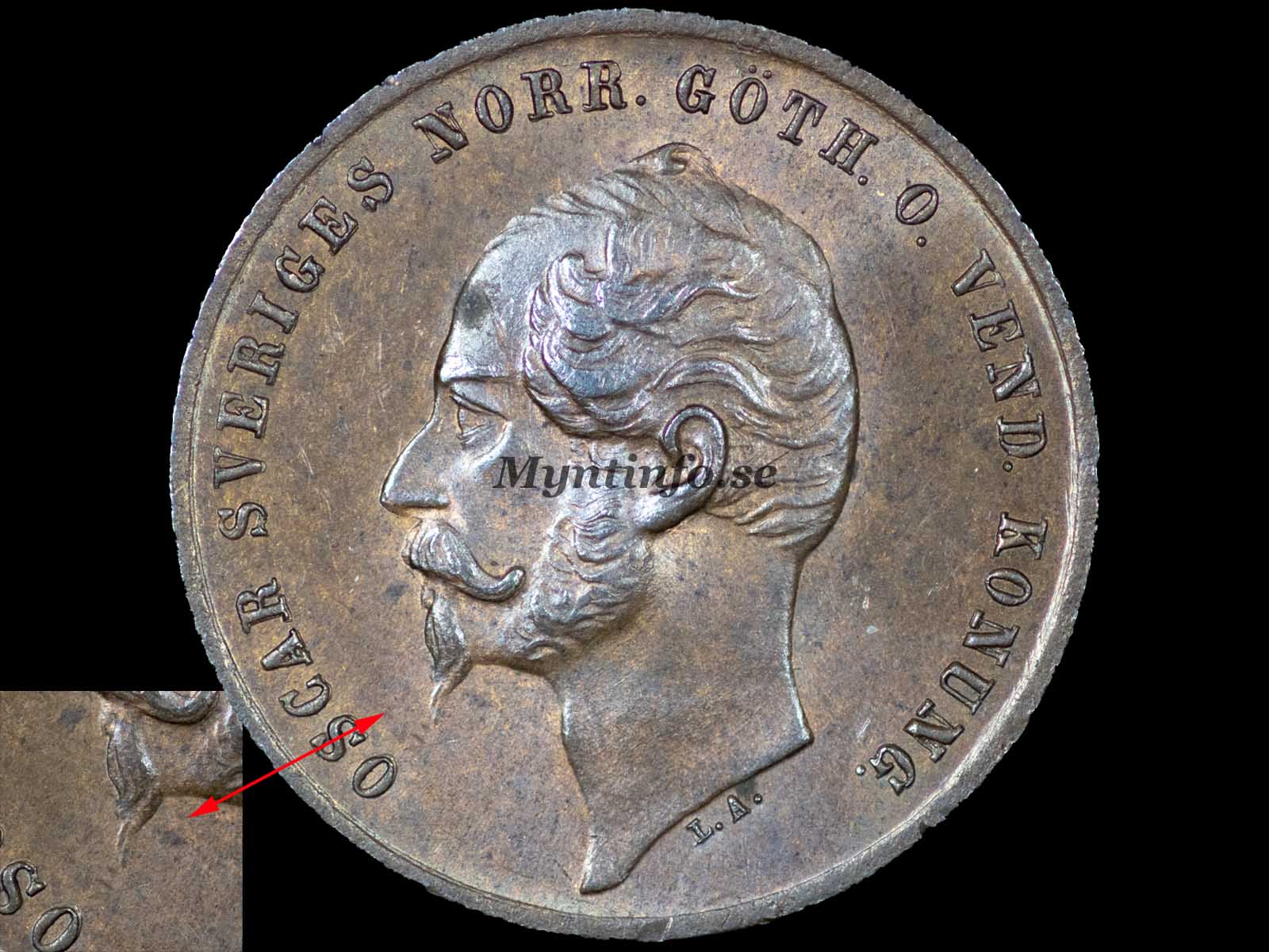En mycket spännande raritet med fyra tydliga detaljer. Utöver den långa skäggspetsen sitter locken högst upp på huvudet i linje med punkten efter NORR. Kransen på baksidan har bladmönstret 2.3.4.5.5 räknat uppifrån och ner. Den mest unika detaljen är dock att samtliga bokstäver N i omskriften är präglade över bakvända N, vilket syns som ett tydligt streck genom bokstävernas nedre del.