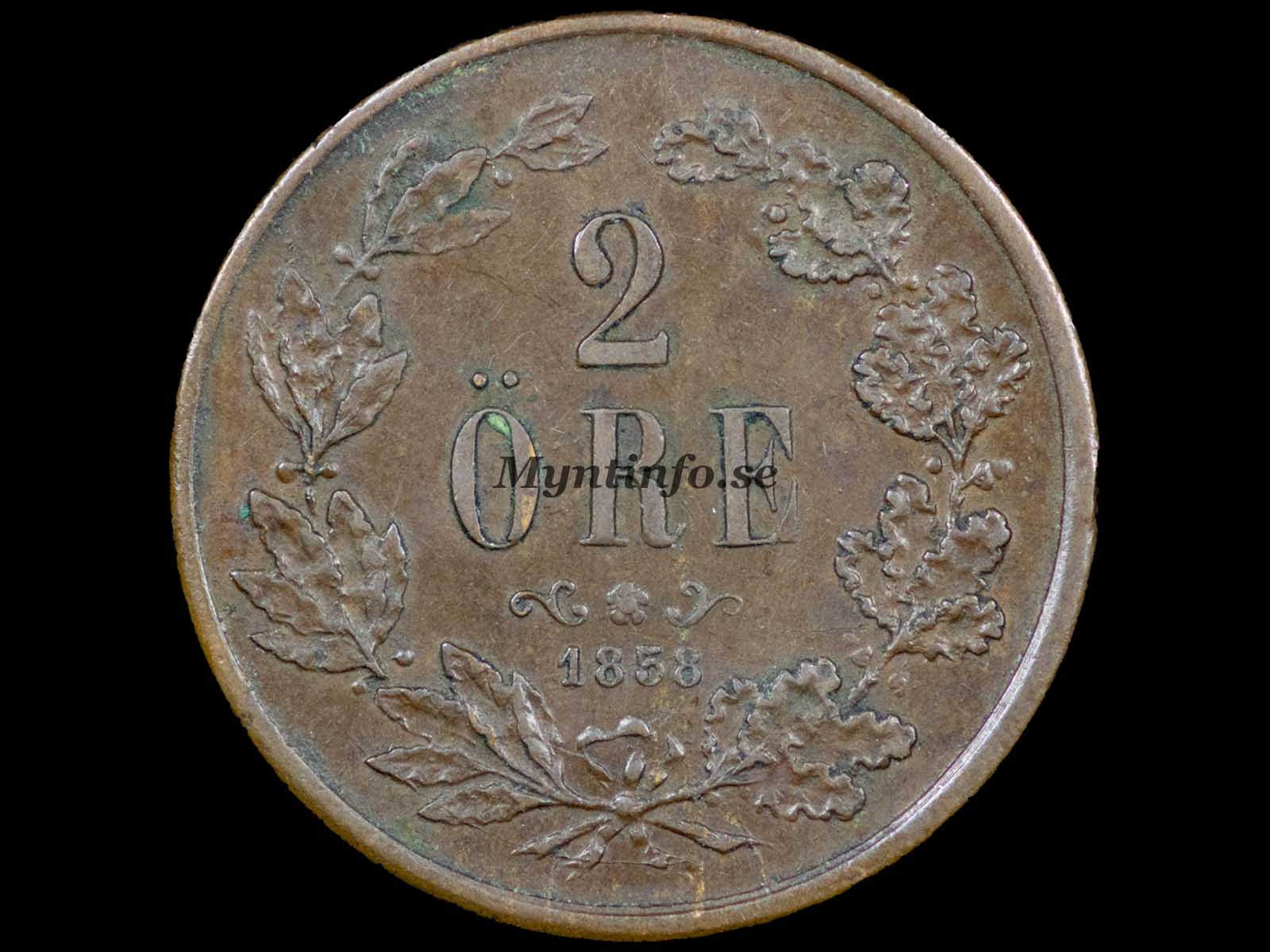 År 1858 är ett mycket intressant år i 2-öres-serien med tre kända huvudvarianter. Det har diskuterats om ytterligare varianter, så som en ”8 på 6”, men det är inget vi på Myntinfo har kunnat verifiera ännu. Med en totalupplaga på hela 2,8 miljoner exemplar är detta ett år där man fortfarande kan göra spännande fynd.