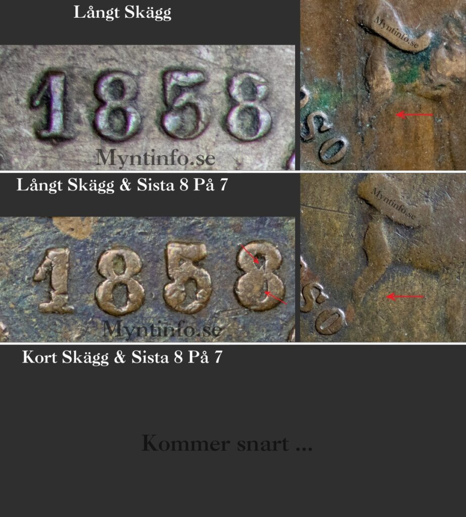 Skillnaderna mellan det långa och korta skägget, tillsammans med omskriftens placering, tyder på att man har använt två helt olika stamptypstilar under 1858. Vår teori på Myntinfo är att Variant 3 (kort skägg) representerar en äldre eller alternativ stampmodell som endast användes i en mycket begränsad omfattning i början av produktionen. Att denna stamp dessutom bär överpräglingen 8 på 7 stärker teorin om att det rör sig om en tidig stamp som man försökt anpassa för det nya året.