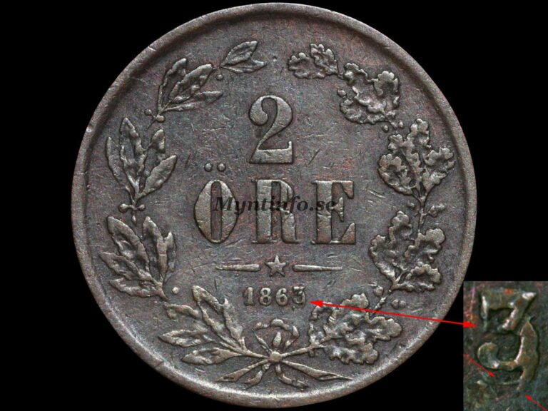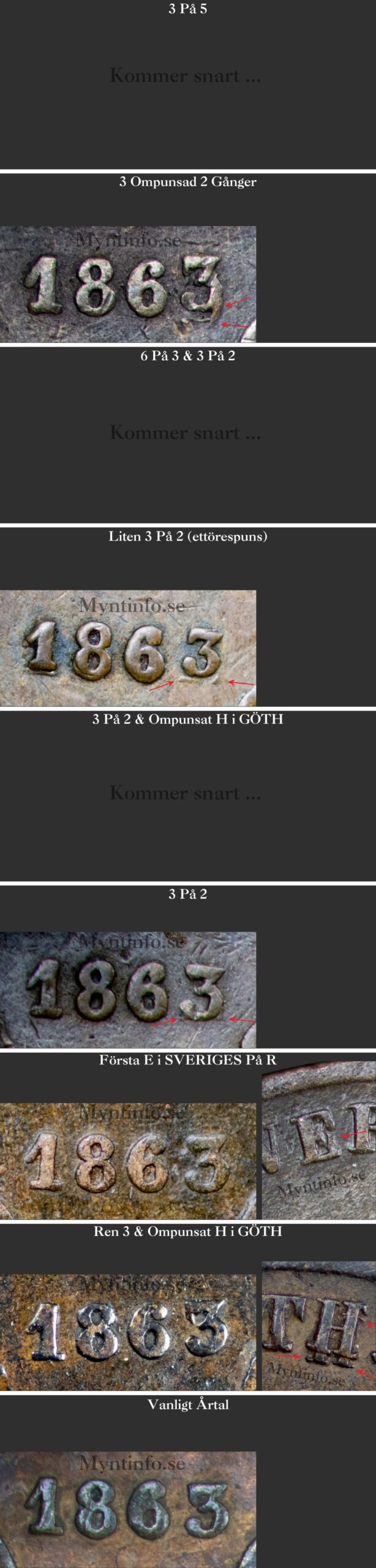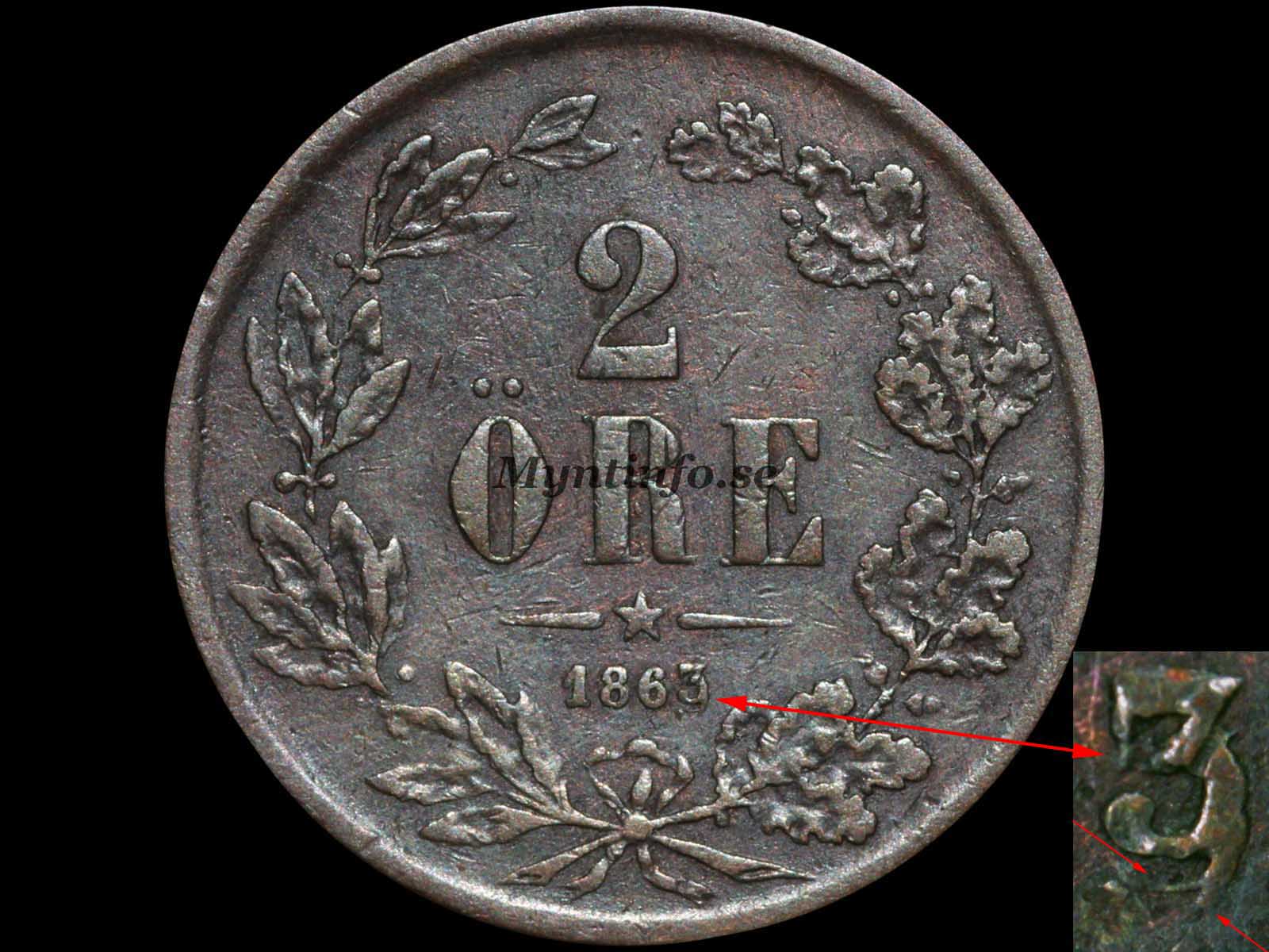 Det extrema antalet varianter under 1863 tyder på ett år av hög produktionstakt kombinerat med slarv eller brist på korrekta punsverktyg. Att vi ser både sifferöverpräglingar (som 3 på 5 och 3 på 2) och bokstavsfel (E på R) visar att man använde gamla stampar och försökte rädda dem i stor utsträckning. Användandet av ettörespunsar (Variant 4) förstärker bilden av att man ibland saknade rätt verktyg för 2-öringen och fick improvisera för att hålla igång pressarna.