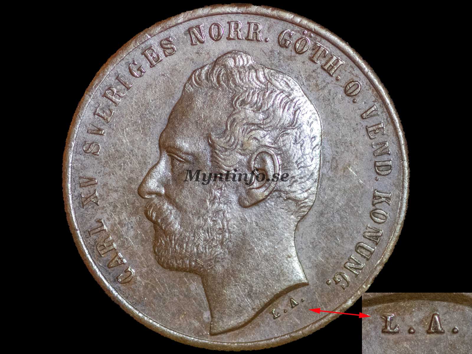 | Framsida (åtsida) | -CARL XV SVERIGES NORR. GÖTH. O. VEND. KONUNG. – L.A. |