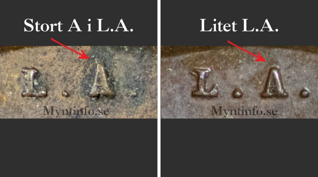 Den första varianten är den mer ovanliga och bör kallas för Stort A i L.A.. Den kännetecknas av att bokstaven A i Lea Ahlborns gravörinitialer på myntets framsida har en något större form i sin helhet. Man kan se att bokstäverna L och A inte är helt jämnstora utan att A:et är något högre, vilket syns tydligast om man studerar toppen av bokstaven.