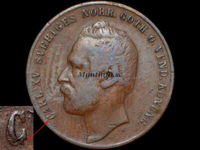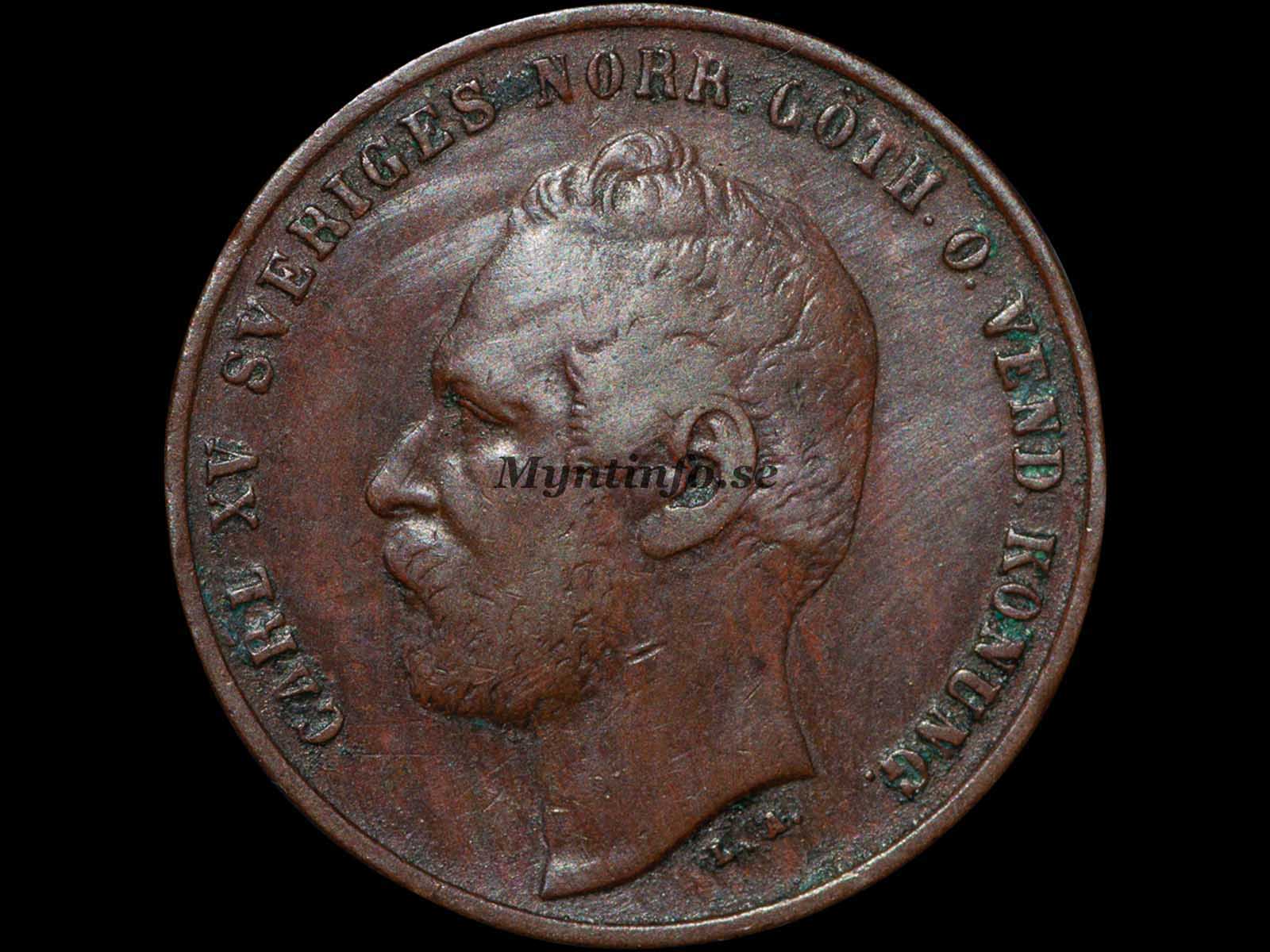 | Framsida (åtsida) | -CARL XV SVERIGES NORR. GÖTH. O. VEND. KONUNG. – L.A. |