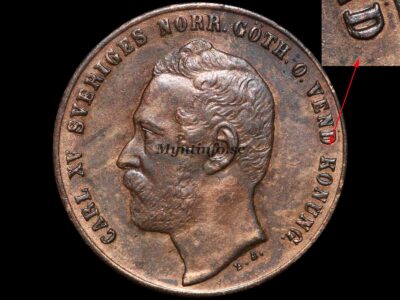 En mycket unik och sällsynt variant där bokstaven R i ordet ÖRE på myntets baksida är ompunsad. Man kan se en tydlig rest av den tidigare punsen upptill på bokstaven.
