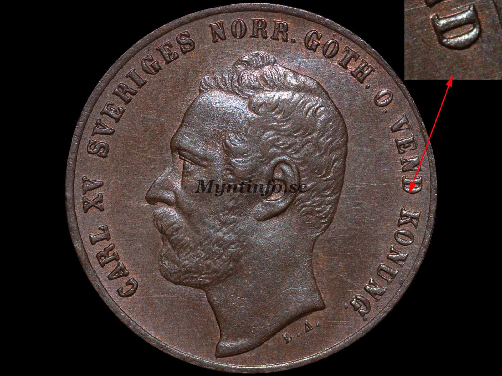 | Framsida (åtsida) | -CARL XV SVERIGES NORR. GÖTH. O. VEND. KONUNG. – L.A. |