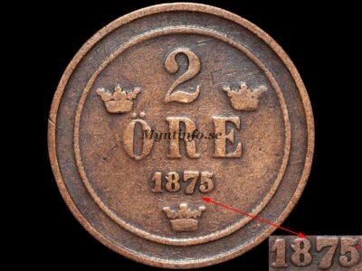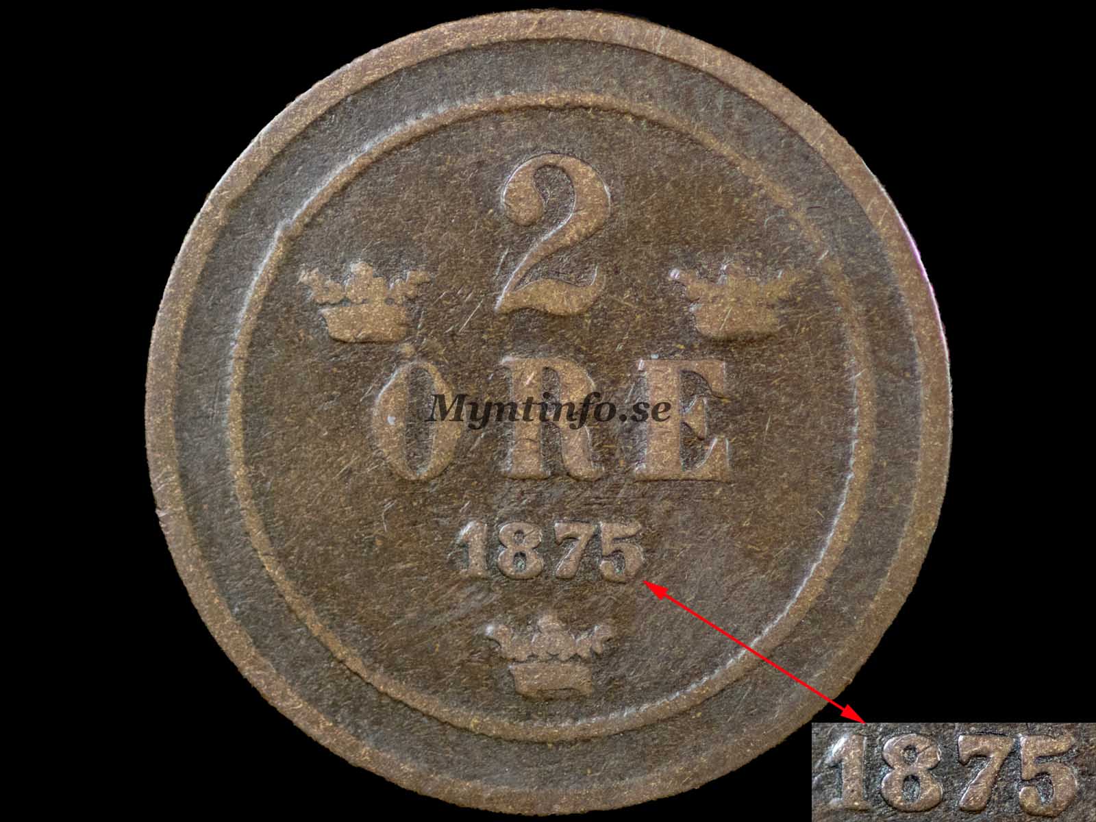 År 1875 är ett mycket intressant och komplicerat år i 2-öres-serien. Oftast talas det enbart om originalpräglingen samt varianten ”5 på 4”, men i själva verket finns det totalt nio kända varianter. Vi på Myntinfo rankar här varianterna från 1 till 9, där 1 är den mest sällsynta och 9 är den vanligaste.