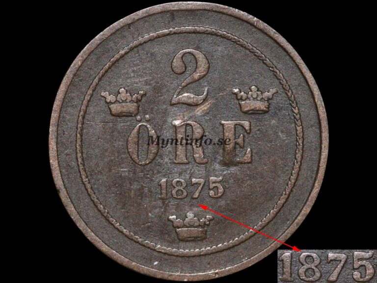 År 1875 är ett mycket intressant och komplicerat år i 2-öres-serien. Oftast talas det enbart om originalpräglingen samt varianten ”5 på 4”, men i själva verket finns det totalt nio kända varianter. Vi på Myntinfo rankar här varianterna från 1 till 9, där 1 är den mest sällsynta och 9 är den vanligaste.