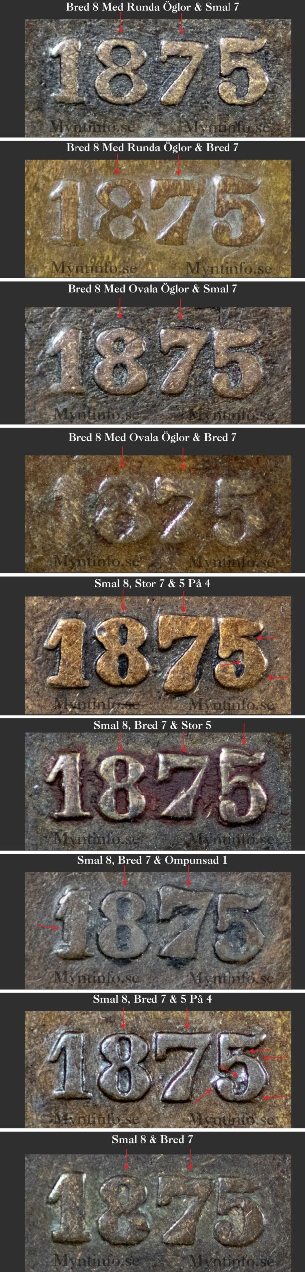 Det enorma antalet varianter under 1875 tyder på att Myntverket genomgick en omfattande förnyelse av sina punsar. Övergången från den breda åttan (Variant 1-4) till den smala (Variant 5-9) skedde troligen gradvis, vilket skapat de många kombinationerna med olika sjuor och femmor.