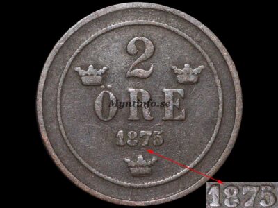 År 1875 är ett mycket intressant och komplicerat år i 2-öres-serien. Oftast talas det enbart om originalpräglingen samt varianten ”5 på 4”, men i själva verket finns det totalt nio kända varianter. Vi på Myntinfo rankar här varianterna från 1 till 9, där 1 är den mest sällsynta och 9 är den vanligaste.