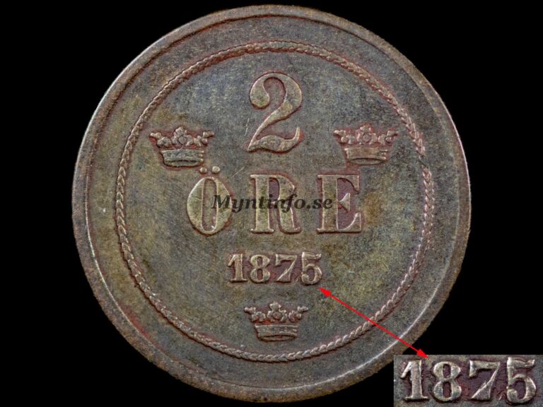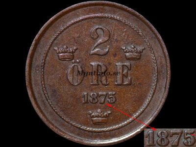 År 1875 är ett mycket intressant och komplicerat år i 2-öres-serien. Oftast talas det enbart om originalpräglingen samt varianten ”5 på 4”, men i själva verket finns det totalt nio kända varianter. Vi på Myntinfo rankar här varianterna från 1 till 9, där 1 är den mest sällsynta och 9 är den vanligaste.