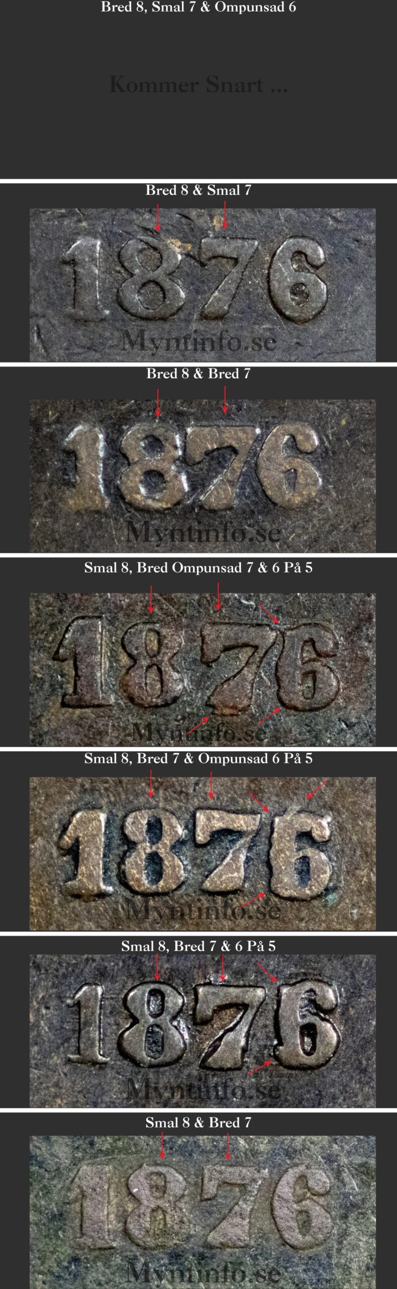 De sju varianterna under 1876 vittnar om ett år med stora förändringar i stampverkstaden. Vår teori på Myntinfo är att man under året bytte ut hela sifferuppsättningen (punsarna) för årtalet. Man gick från den breda stilen (Variant 1-3) till den smalare, mer kompakta stilen (Variant 4-7).